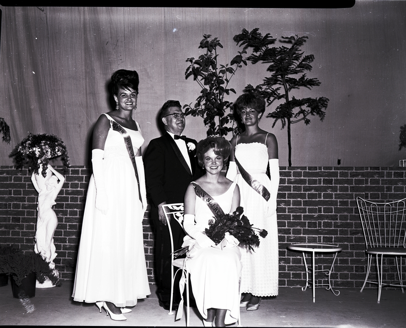 Cheryl Couch, winner of the Miss Twin Falls pageant, is seated and holding a bouquet of roses, while runners-up Pamela Jones and Deanna Peterson stand behind her with a man. The event was sponsored by the Twin Falls Lions Club and held at the Twin Falls High School gymnasium. The women are dressed in formal gowns and sashes, and Cheryl Couch wears a tiara. The man wears a tuxedo with a bow tie and has a corsage in his jacket. Some potted plants, a statue holding a flower arrangement, and a table and chair are in the background.