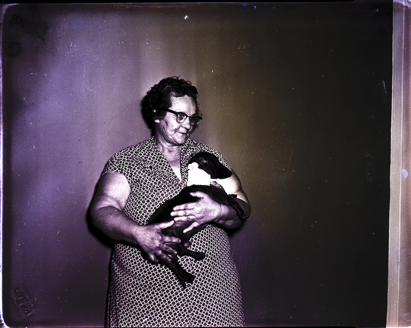 - Mrs. Marie Presnell holds her two-year-old dachsund, Eric, who has a brace around his neck. The dog was found with slash wounds on his throat. The cuts, which were inflicted either by a person with a knife or another dog, required thirty-seven stitches to close.