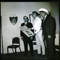 From left to right, Thomas Shouse, fair manager, Harold Hove, acting chairman of the fair board, and Cotton Rosser, producer of the 1965 rodeo, look over a flier at a fair board press dinner. The flier reads "Twin Falls County Fair. Filer, Idaho. Rodeo Cotton Rosser Flying U Rodeo Co. World famous clowns and bullfighters Wilbur Plaugher and Joaquin Sanchez, Chuck Parkinson announcer. Sept. 8-9-10-11. Free afternoon entertainment Sept. 8, 9, 10. Riding club jamboree and drill Saturday, Sept. 11 Horse Show. Night rodeo Sept. 8, 9, 10, 11. Livestock and crop exhibits. $12,000 premium money." A photo of a cowboy on a bucking horse is on the front of the flier. Thomas Shouse and Cotton Rosser are dressed in suits and ties, and Cotton Rosser is wearing a cowboy hat. Harold Hove is dressed in a white shirt and pants and is holding the flier. Behind them are some chairs against the wall, a framed certificate, and a Lions International insignia hangs on a plaque on the wall.