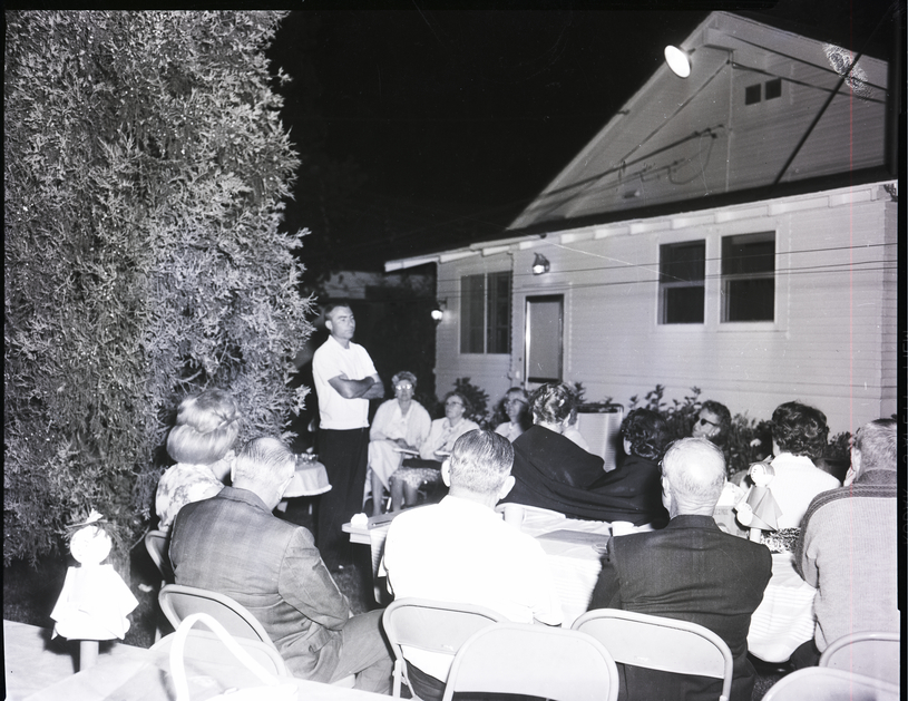 The Art Guild of the Magic Valley gathers in the backyard of the home of Mr. and Mrs. Earl Peck for a barbecue marking the end of the fiscal year. The men and women are seated in folding chairs at long tables covered in white table cloths. Ashtrays, cups, and a centerpiece of a doll holding a painter's palette are on the tables. A fir tree is to the side. The house is in the background.