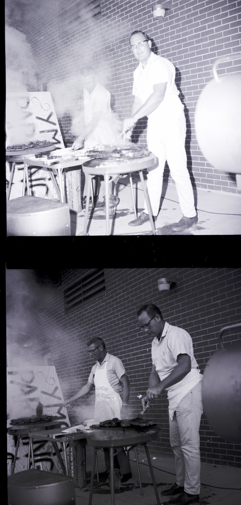 Cooking steaks on barbecues at the First Annual Twin Falls YMCA Men's Steak Barbecue is Lou Thorson, left, and Lloyd Bledsoe, right. The barbecue was to raise funds for programming and operating expenses of the YMCA. The two men are wearing aprons. A sign reading "YMCA Parking" is propped up against a wall to the side of the barbecues. The brick building is in the background behind them.