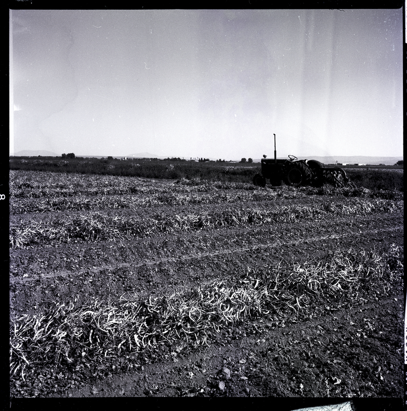 - A field of beans is cut into windrows. A tractor sits at the edge of the field. Some trees are seen far in the background, on the horizon.