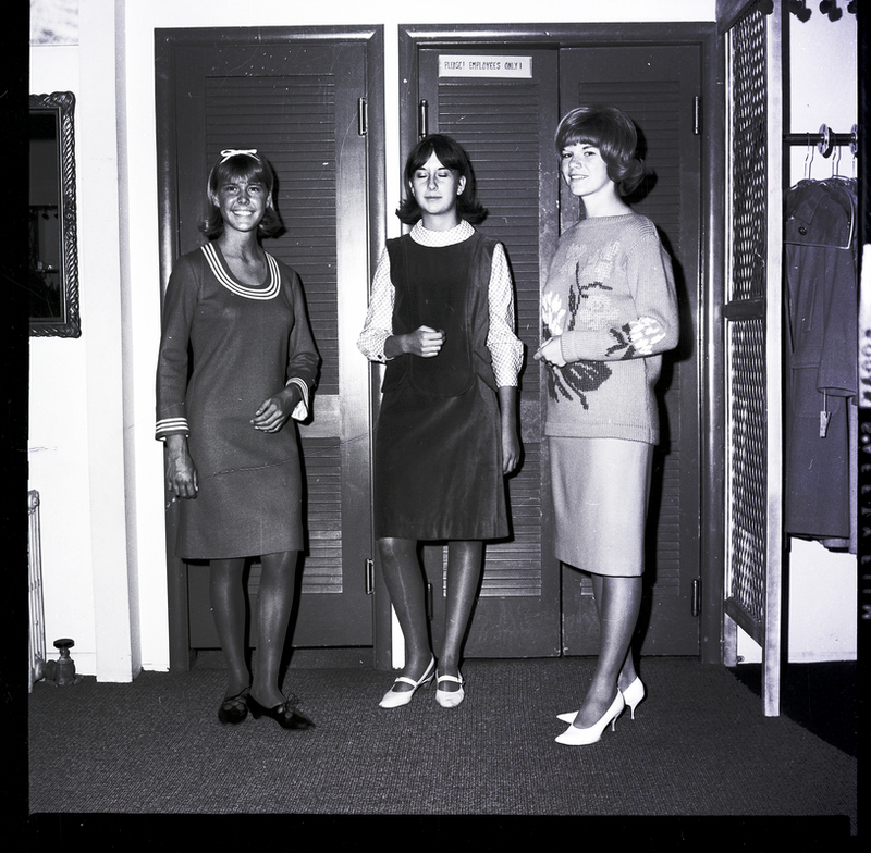 Three teenage girls model some back-to-school fashions for the Twin Falls High School Girl's League Fashion Show. From left to right are Connie Babble, Cathy Pond, and Pam Jenkins. Connie Babble is wearing a one-piece dress with a striped collar and cuffs, Cathy Pond is wearing a skirt and tunic top over a checkered blouse, and Pam Jenkins is wearing a sweater with a floral design and a skirt. The doors to some dressing rooms are behind them, and a sign on the door reads "Please! Employees Only!" To the sides of the dressing rooms, a mirror and some dressing hanging from hangers are visible.