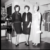 Mrs. Jack Shaw, Mrs. Gordon Cox, and Mrs. C. A. Perkins model fashions for a fashion fair for women attendees of the Utah-Idaho Kiwanis District Convention. All fashions will be furnished by The Paris. Mrs. Shaw is dressed in a skirt and shirt, long gloves, a scarf draped over her head, and is holding a purse. Mrs. Cox is dressed in a skirt, shirt, and jacket. Mrs. Perkins is dressed in a long evening gown, short white gloves, and is holding a purse. Behind them are two dressing rooms, and to the sides is a display of jewelry and several shirts hanging from hangers.