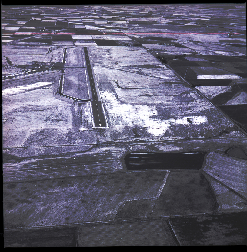 An aerial photograph shows the Twin Falls Joslin Field airport. A large runway is visible, with the number 7 painted on the end. Taxi lanes are seen to the side of the runway. Several roads, fields, and trees are visible in the aerial view.