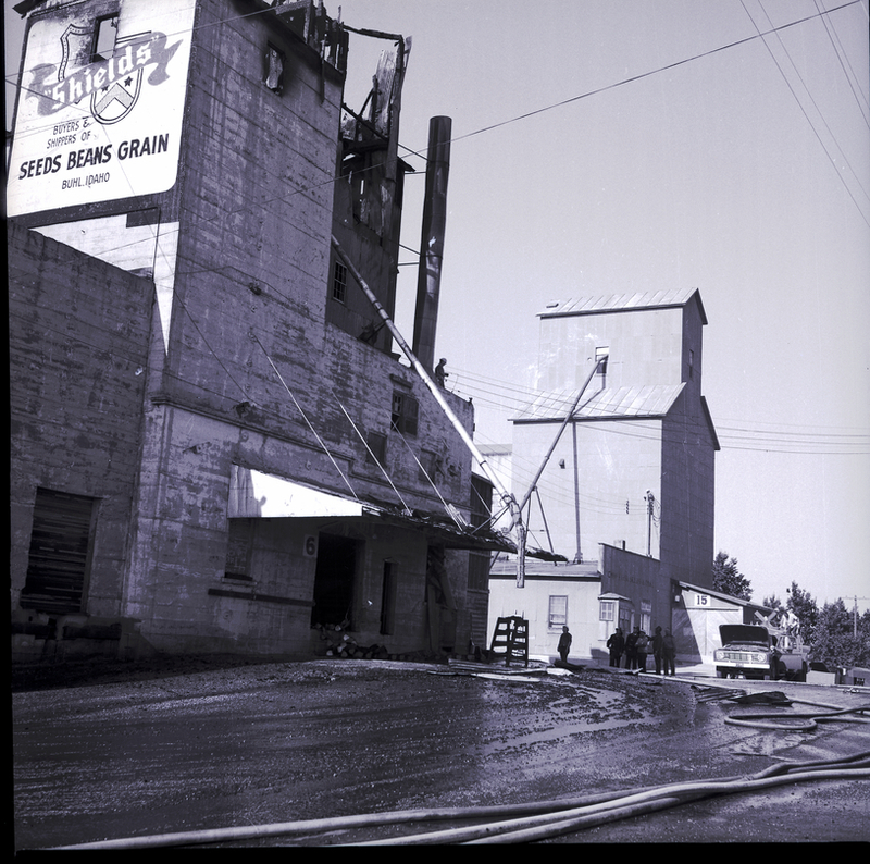 The Shields Warehouse in Buhl shows significant damage after the building caught on fire. On the side of the building is a large sign that reads "Shields Buyers & Shippers of Seeds, Bean, Grains, Buhl, Idaho." At the bottom of the building is a doorway labeled "6". Several men in hard hats and firefighters stand to the side, looking up the building. Behind them is a parked pick-up truck and another warehouse building. Large hoses lay across the street.