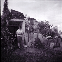 Mrs. Max Dayley stands in the entrance of a fallout shelter. The shelter is dug out of the side of a hill, and lava rocks, plants, flowers, shrubs, and long grass have been used to provide landscaping. The inner shell of the shelter is made of reinforced concrete and concrete blocks, topped by four feet of dirt.