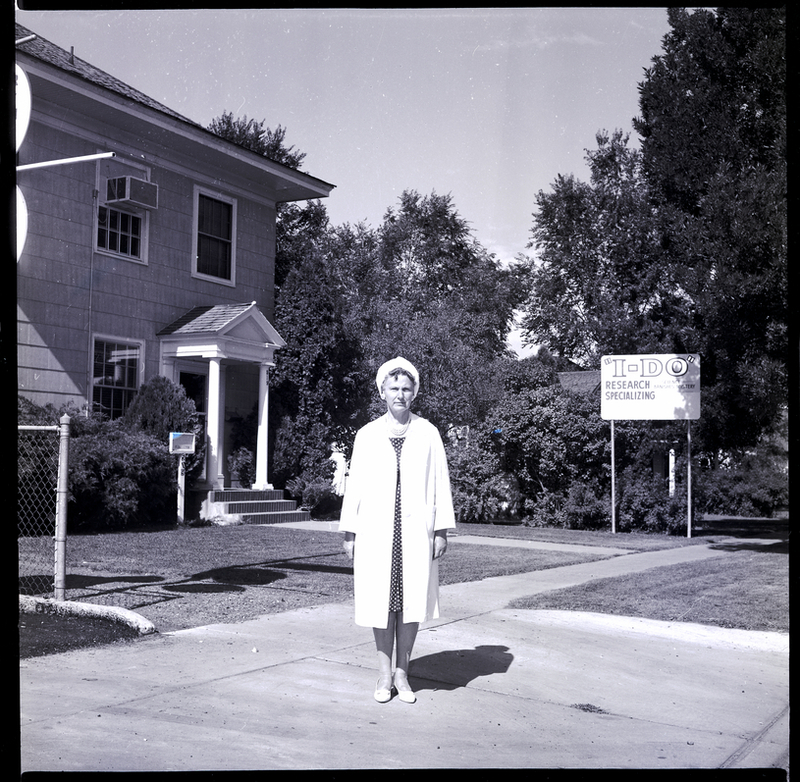 Frances Sande, organizer of the Interdenominational Divine Order, stands outside the I-Do building located on 519 Main Ave. W. in Twin Falls, Idaho. She is dressed in a polka dot dress, white jacket, and a white scarf wrapped around her head. The sign outside the building reads "I-Do Research Specializing, Science Banishes Mystery." Several trees and shrubs surround the building.