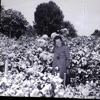 Mrs. Howard Gillette, dressed in a long coat, stands in a garden looking over the snow-covered dahlias after the first heavy snowfall in Twin Falls. Mrs. Gillette won several ribbons at Twin Falls County Fair with her dahlias and worries about damage from the early snowfall. Several trees and bushes are in the background, the branches covered in snow.