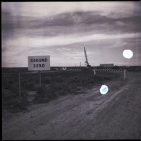 - A dirt road leads up to the Project Pre-Schooner II site on Bruneau Plateau. A sign surrounded by sagebrush nearby reads "Ground Zero." In the background behind a wooden A-frame barricade are several trucks, a shack, and a construction crane.