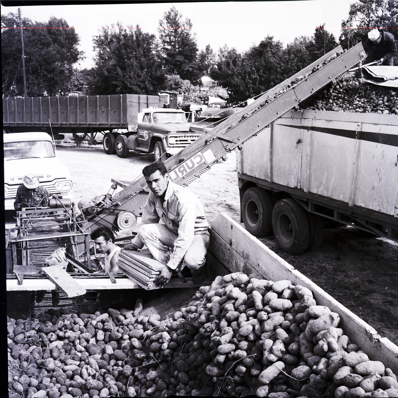 Several men work on unloading trucks filled with potatoes during the potato harvest. Potatoes move down a conveyor from the top of the truck, and one man is at the top of the conveyor and several are below it. One man sits in the potato pit with a stack of wooden boards in front of him. Another truck and several trees are in the background.