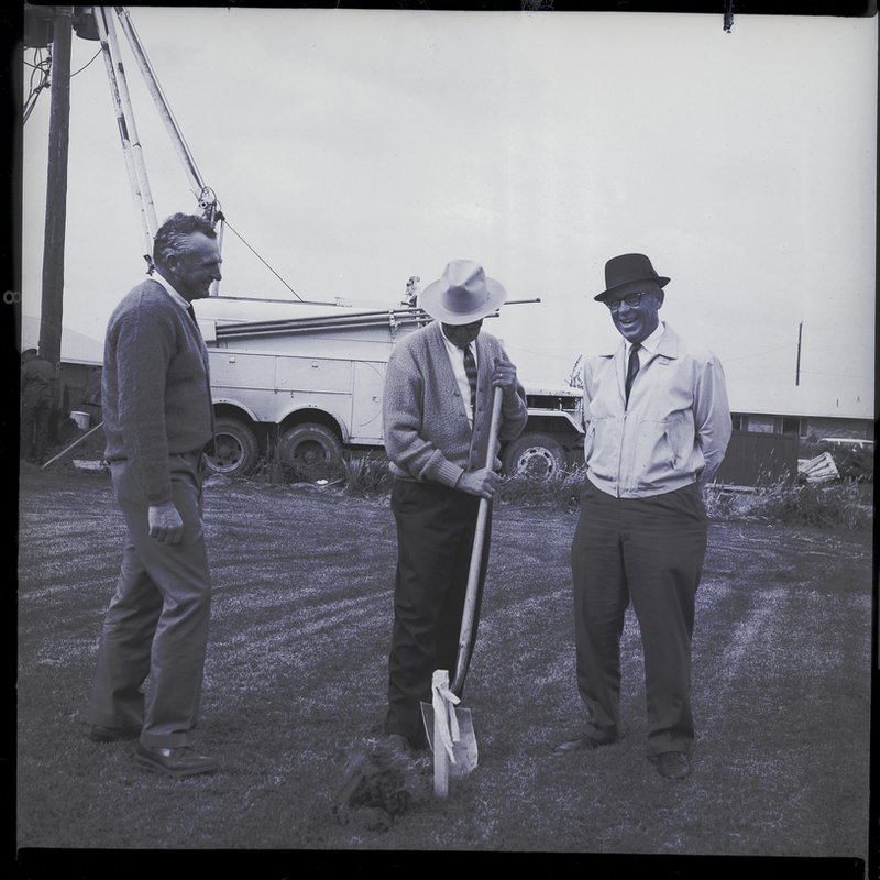 From left to right, County Commissioners Heber Loughmiller, Morris Carlson, and Maurice Klaas break the ground for the new Sky View Manor addition. The new $50,000 addition will contain 19 beds, a dining room, and a laundry room, and will be constructed of brick. Mr. Carlson, dressed in a sweater, pants, tie, and cowboy hat, digs a spade into the ground near the marker stake while the other two men watch. A truck is on the side of the lot, and a house is visible in the background.