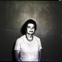 - Mrs. Robert Miller, president of the Wesleyan Service Guild, stands in a hallway. She is wearing a white dress.