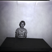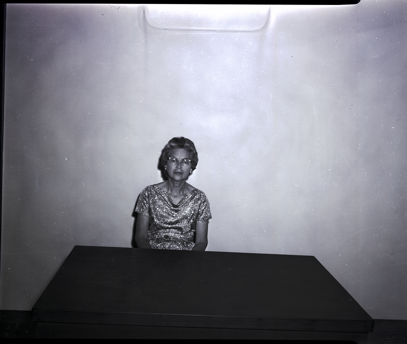 - Mrs. Earl Walker, president of the Scribblers Club, sits at a desk. She is wearing a spot patterned dress.