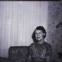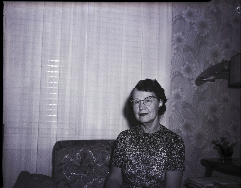 Mrs. Earl S. Johnson, president of the Twin Falls Past Presidents Parley, sits in a recliner in a living room. She is wearing a patterned dress. Behind her is a wall covered in a floral wallpaper and a window covered in drapes. A stand next to the recliner has several books, a small flower pot, and a lamp on it.