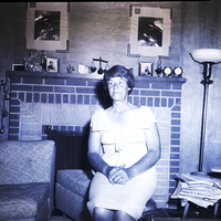 Mrs. Harold Morrison sits on a settee in a living room. She is wearing a dress. Beside her is a couch and a stand covered in newspapers. A lamp sits in the corner. Behind her is a fireplace, and on the mantle are some framed photographs, glass elephant figurines, a small scale, and a clock. Two framed pictures hang on the wall above the fireplace.