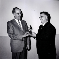 Standing to the right, H. L. Derrick, city manager, awards Twin Falls City Commission Chairman Egon Kroll with the "A" Award, a trophy that looks like a stick figure man with a teardrop-shaped head. The award was given to the city of Twin Falls during the