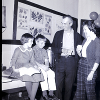 Dilettante lead players Lynette Berry, Mark Herzinger, James LaGrone, and Mrs. Marty Mead meet for a cast call. Lynette Berry, seated on a counter and wearing a dress, holds the score for "The Music Man," and Mark Herzinger, wearing a patterned shirt and slacks, sits beside her. James LaGrone and Mrs. Mead, dressed in shirts, sweater jackets, and slacks, hold Styrofoam cups. Some pictures of different leaves are on the bulletin board on the wall behind them. Some balloons are in the corner of the room.