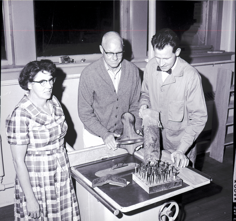 Items and tools used for woodworking and leathercraft are displayed by Mrs. R. O. Jacky and Walter Olson, two enrollees in a Twin Falls Recreation Department-sponsored adult leathercraft and woodworking class. Ray Beaumont, instructor of the course, admires the items. Mrs. Jacky is dressed in a plaid dress, Mr. Olson wears a button-up sweater, and Mr. Beaumont wears a bow tie and work coveralls. On the table is a saw, knives, a leather wallet, a wooden ornament, and a log with the image of an elk carved into it.