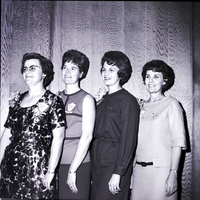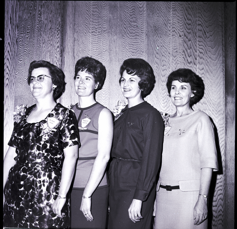 Officers for the new District No. 3 Epsilon Sigma Alpha sorority pose against a wall. From left to right are Mrs. Joe Hinz, treasurer; Mrs. Keith Uscola, vice president; Mrs. Arthur I. Ball, state president; and Mrs. Clifton Peterson, president. They are wearing dresses, corsages, and name tags.