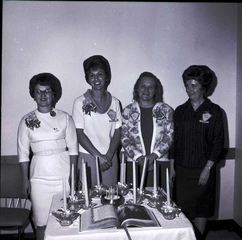 - Epsilon Sigma Alpha members stand behind a table covered in a white table cloth and displaying an open book and several candles. The women are wearing dresses, corsages, and name tags. Some chairs are against the wall behind them.