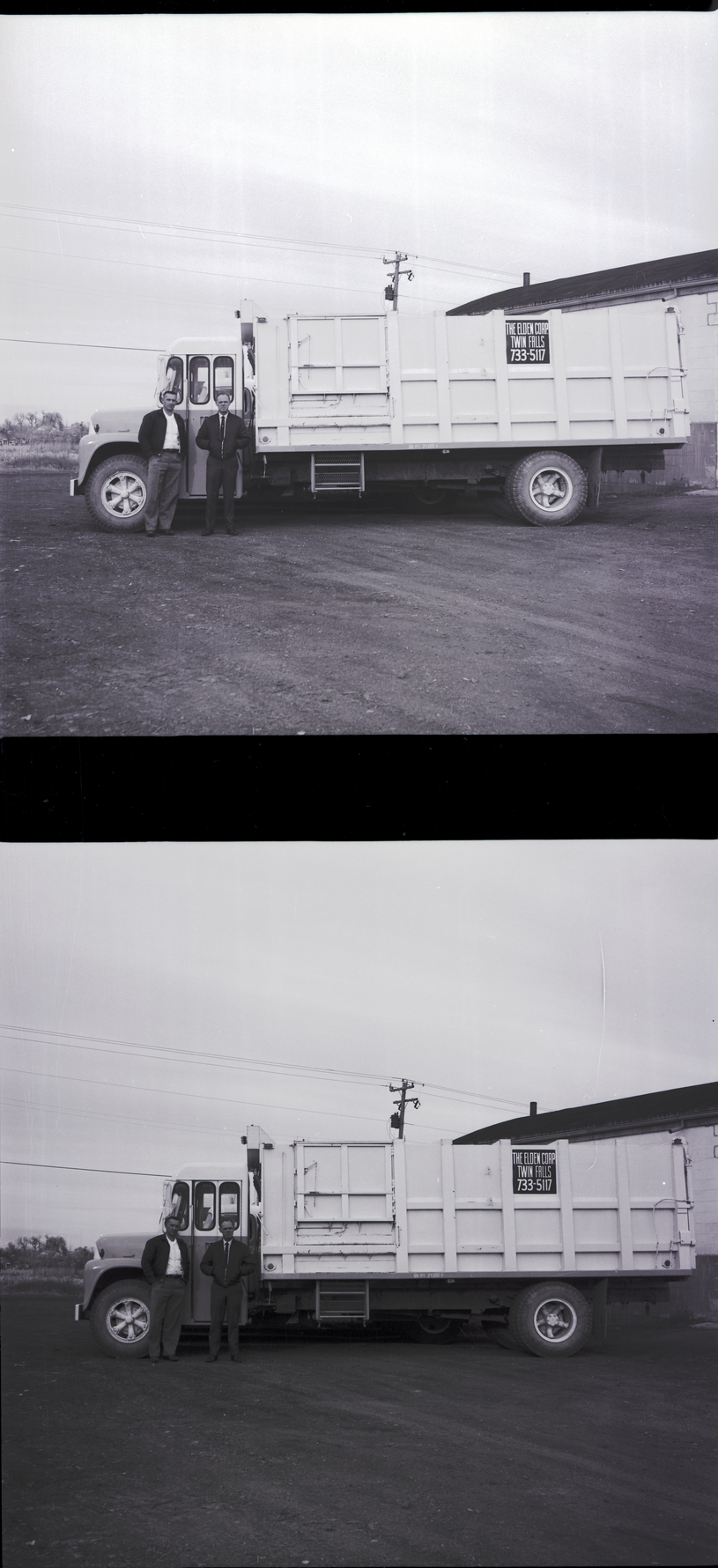 Harry Knigge, sanitation company foreman, and Chad Thompson, city sanitation inspector, stand in front of a new garbage truck owned by the Eldon Corporation. The side of the truck reads "The Elden Corp, Twin Falls, 733-5117." A building and a field with trees are in the background.