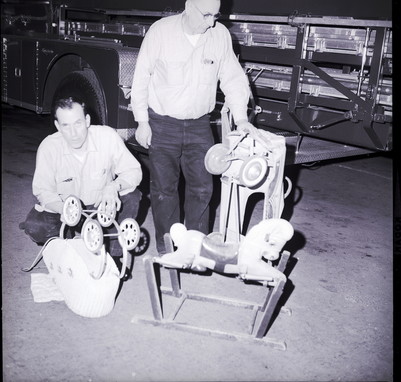Repairing broken toys to be given for Christmas to underprivileged children are TFFD firemen James Miller, left, and Herman Carlton. Mr. Miller works on repairing a baby carriage, while Mr. Carlton works on repairing a toy car. A rocking horse is in front of them. A fire engine is in seen in the background.