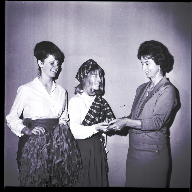 Mrs. Twila Bigler, state sports director, right, presents a special recognition award for having the most girls participating in an LDS dance drill to Dianne Hansen, a representative of the Sixth Ward LDS drill team. Standing beside her is Joan Elledge, whose team won top honors in the stake drill team competition. Ms. Hansen is dressed in a pleated skirt, plaid drape, and plaid hat, and Ms. Elledge is dressed in a white shirt and black pants and is holding pom-poms.
