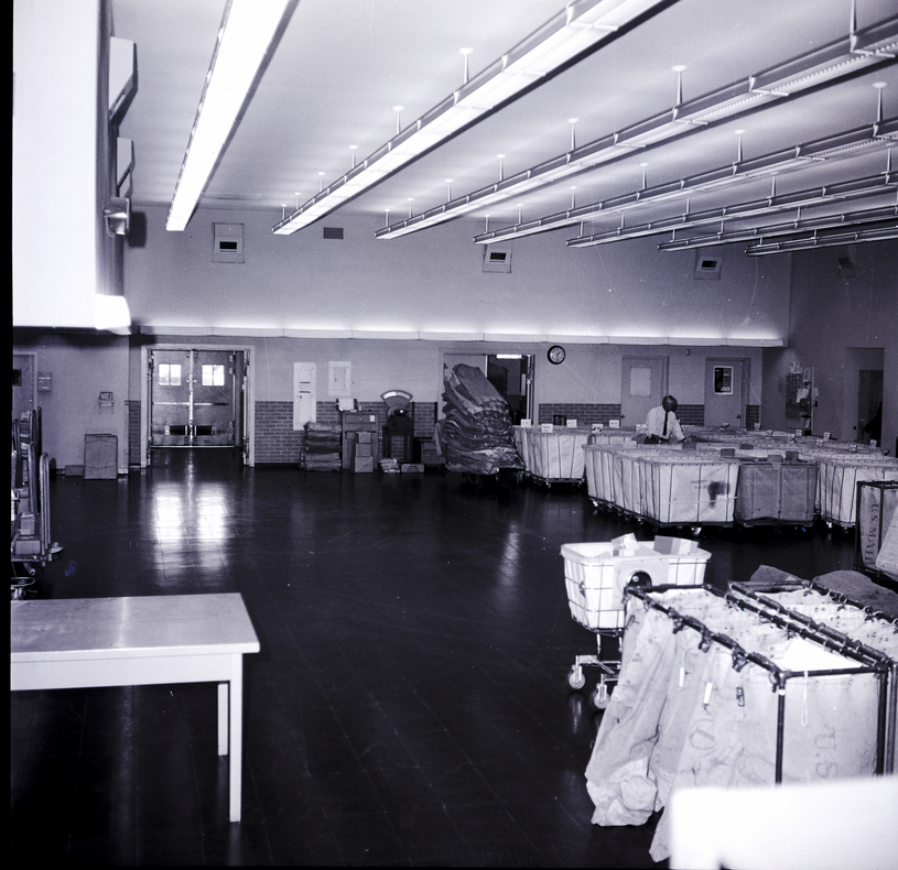 Looking over empty hampers that were bulging with undelivered Christmas parcel post only a few days ago is Albert Hoover, parcel post delivery man for the Twin Falls Post Office.