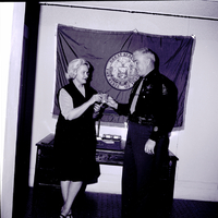 Toasting the New Year with a cup of coffee is Idaho State Police Lt. Dean Bennett and Mrs. Wiley Dodds. The State Police, District 4, will give free coffee and chewing gum to all motorists stopping at Cottrell and Hollister Ports of Entry, in an effort to prevent accidents caused by drinking. Behind them is a desk, and on it are a lamp, Post-It notes, and a three-ring binder hole punch. Hanging on the back wall is the Idaho state flag.
