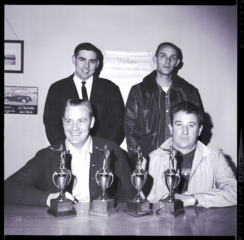 TFPD are displayed by members of the team. Standing from left to right are Bill Vickers and Terry Pierce, and sitting from left to right are Gary Bates and Lee Talkington. On the wall behind them is a poster of the Bill of Rights, a framed photograph, and an illustration of a car.