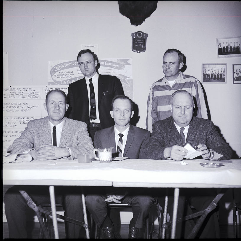 Panel members for the Beef Cattle Field Day meet at the Buhl Moose Hall. Standing from left to right are Ron Koerfer, stockbroker for Schwabacher and Co., and Dr. H. E. Hammerquist, Buhl veterinarian. Seated from left to right are Dr. Joe Dahmen, superintendent of the University of Idaho Caldwell branch experiment station, Dr. Dale Behmer, agronomist of the U. S. Steel Corp., and Ray Lincoln, county cattleman and sheepman. Dr. Hammerquist is dressed in a striped shirt, and the rest are wearing suits and ties. Some cups, papers, and an ash tray are on the table in front of them. Posters, photographs, a plaque, and a moose head are on the wall behind them.
