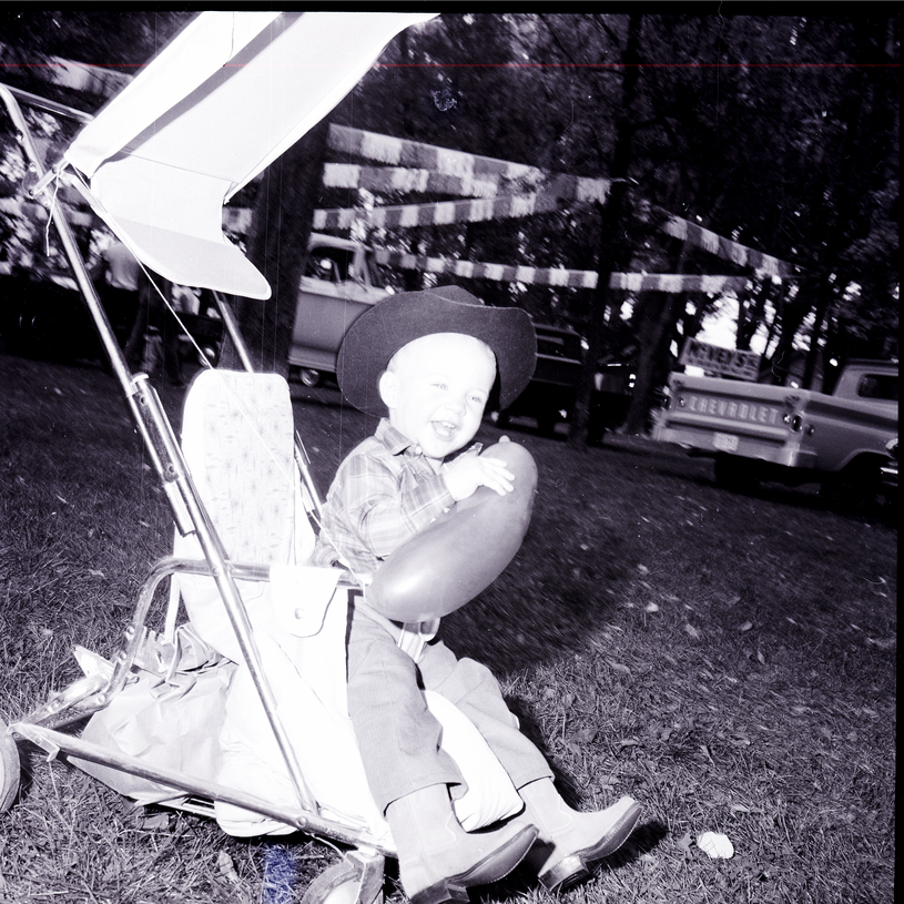 A little boy in a cowboy hat and boots sits in a stroller holding a balloon at the Twin Falls County Fair. In the background is a showing of Chevrolet pick-up trucks.