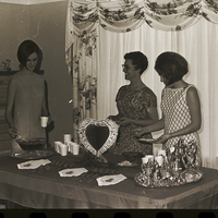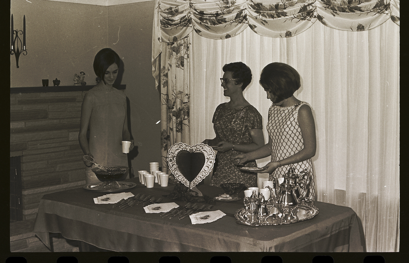 Dr. Adele Thompson, dressed in a floral print dress, stands beside a refreshment table as an official hostess at a tea held at CSI. Denise Keyt, dressed in a lattice-patterned dress, stands beside her. Ilene Campbell stands at the end of the table ladling punch from a large punch bowl into a Styrofoam cup. On the table are cups, spoons, napkins, a punch bowl, a small plate of cookies, and a silver tea set. A heart decoration is used as a centerpiece. In the room behind the women is a brick fireplace with several figurines on the mantle, and a large window covered in curtains.