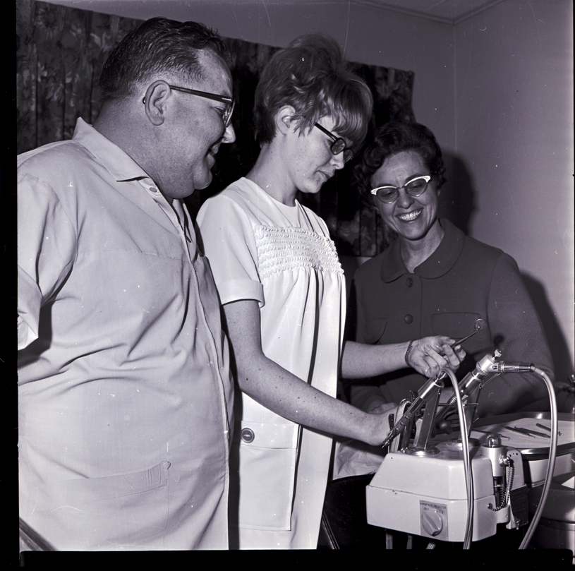Medical office practice student Andrea Briggs displays her knowledge of various dental tools to Dr. Adele Thompson and Dr. Donald Sonius, in whose dental office she is learning medical office terminology.