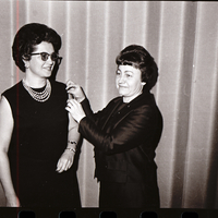 Two winners of the Luther Hulsey Gulick award for outstanding leadership in the Twin Falls Camp Fire Girls Council, Mrs. Frank Depew, left, and Mrs. Orval Johnson, admire the pins presented to them at the council's annual dinner meeting at the Holiday Inn.
