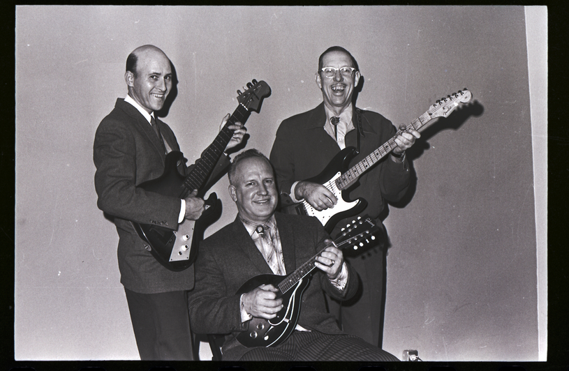 Three men dressed in suits and bolo ties play their guitars at the Country Music Jamboree appreciation dinner held at the Twin Falls Moose Hall.