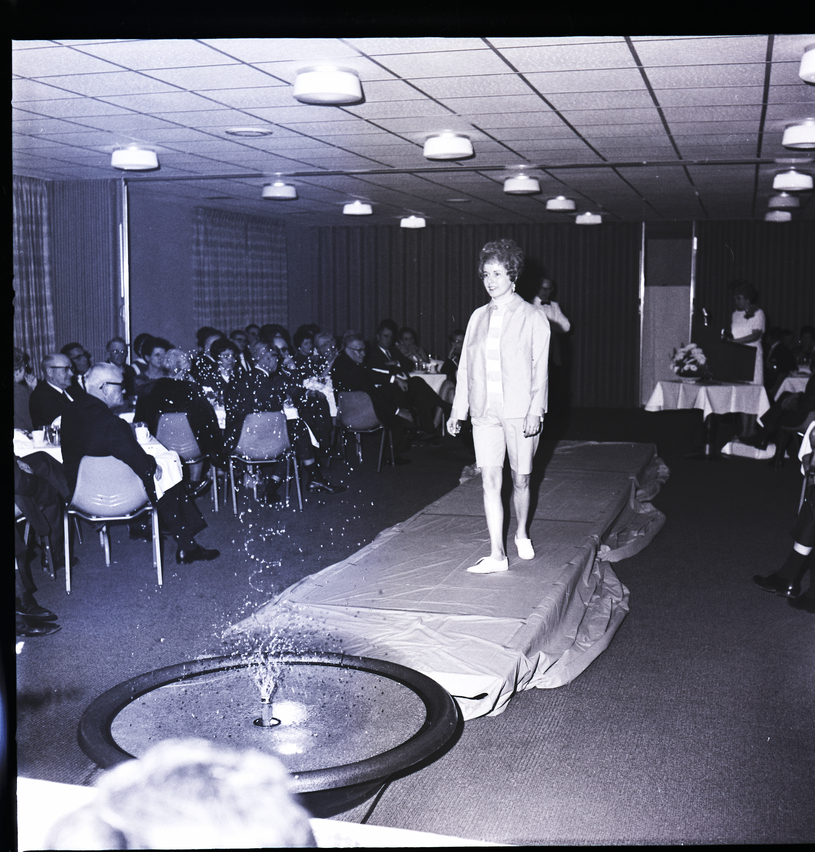 A woman models shorts, a striped shirt, and a jacket at a fashion show during the Filer Kiwanis Club Ladies' Night held at the Twin Falls Holiday Inn. She walks down a runway with a fountain at the end. Several people sit in chairs at the side of the room, watching. At the back of the room is a table covered in a white tablecloth with a bouquet of flowers on top, and Mrs. Morris Carlson, the narrator of the event, stands behind it.