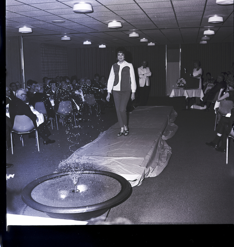 Mrs. Robert Blastock Jr. models a turtleneck and pants at a fashion show during the Filer Kiwanis Club Ladies' Night held at the Twin Falls Holiday Inn. She walks down a runway with a fountain at the end. Several people sit in chairs at the side of the room, watching. At the back of the room is a table covered in a white tablecloth with a bouquet of flowers on top, and Mrs. Morris Carlson, the narrator of the event, stands behind it.