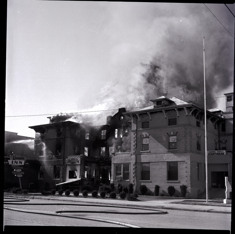 Tongues of flame lick through windows and smoke billows up from the Lincoln Inn in Gooding. The Cellar Bar Club and Gooding County Court House offices were also destroyed in the fire. Long hoses trail across the street.