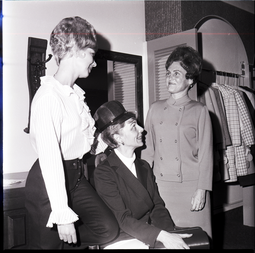 Wearing current fashions from the Sweetbriar, models Mrs. Jack Bolyard, left, and Mrs. Tom Wilkins discuss last minute plans for the Ladies of Elks Fashion Show with Mrs. John Christoffersen, right, general chairman of the show. Mrs. Bolyard is dressed in slacks and a ruffled blouse, Mrs. Wilkins is wearing a blazer and cap, and Mrs. Christoffersen is wearing a matching skirt and top. A mirror and a coat rack hang on the wall behind them. Several jackets hang on hangers in a closet.