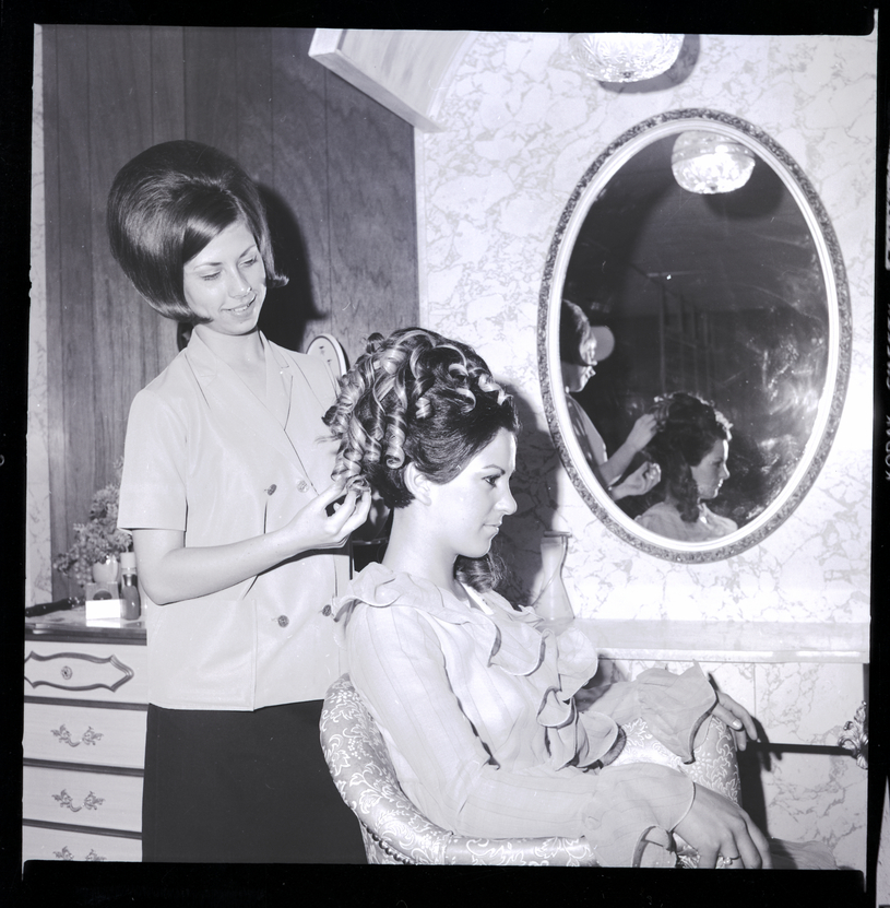 Mrs. John Anderson II has her hair styled in by Bonnie Reid at the Swingin' Set in preparation for the St. Edward's Parents Club's annual fashion show. Fashions will be supplied by The Paris, Paris Jr., and Van's Department Store. Mrs. Anderson is seated in a chair and wearing a ruffled blouse while Ms. Reid stands behind her arranging a wiglet of curls on top of her head. A mirror hangs on the wall beside her. In the corner is a dresser with a vase of flowers on top.