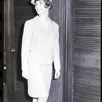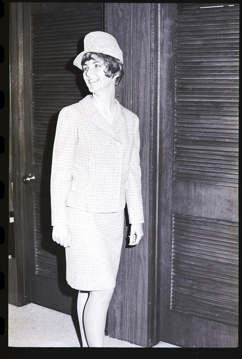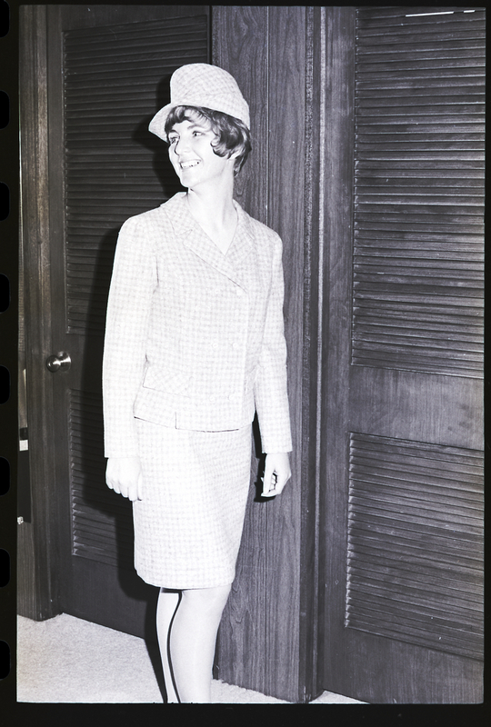 Mrs. Darrell Smith models a checkered jacket, skirt, and hat from the Roper Clothing Store for the Jay-C-Ettes annual fashion show. Behind her are some dressing room doors.