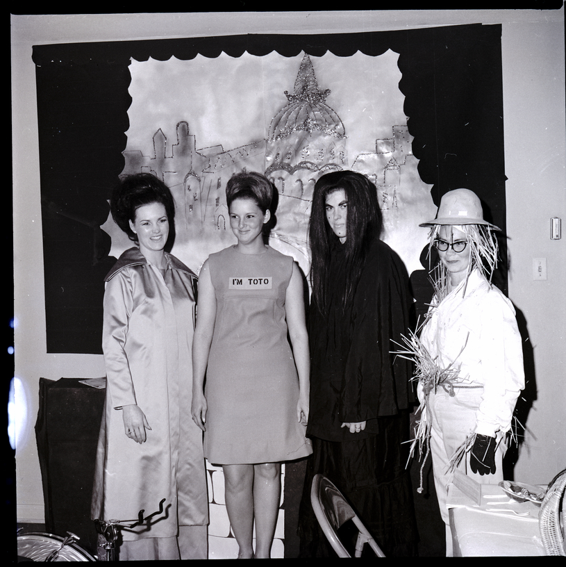 Four members of Nu Phi Nu chapter of Beta Sigma Phi are dressed as characters from "The Wizard of Oz" for their rush party, held at the home of Mrs. Loree Dobbs. From left to right are Helen Kuykendall, Mrs. Loree Dobbs, Elaine Putzler, and Marge Vecera. The girls are dressed as Glenda, Toto, the Wicked Witch of the West, and the Scarecrow. Behind them is an illustrated backdrop of the Emerald City.