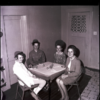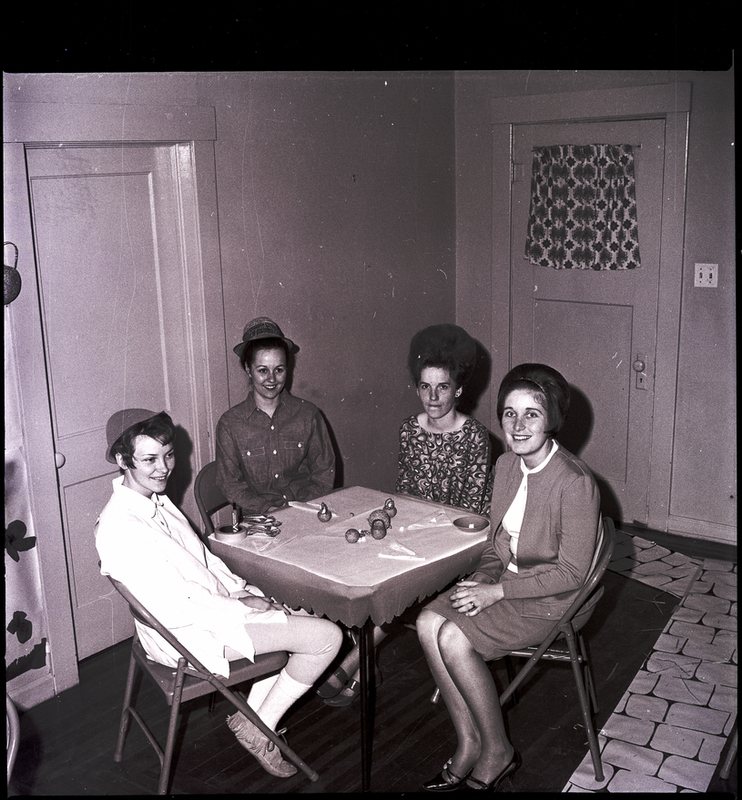 Four members of the Nu Phi Nu chapter of Beta Sigma Phi sit around a table at their rush party, held at the home of Mrs. Loree Dobbs. On the far left is Mary Ruth Roan, dressed in a Munchkin costume, and seated beside her is Sandra Gose, who is wearing a hat. Some forks, napkins, decorations, masking tape, and a marker are on top of the table. A yellow brick road decoration is taped to the floor.