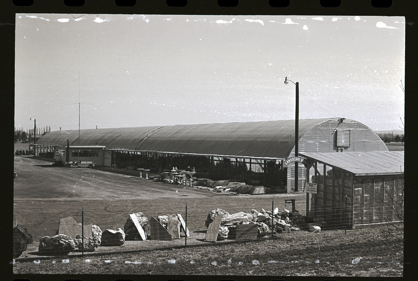 Several plants and trees sit under the greenhouse roof at Kimberly Nurseries' new building along Addison Avenue East. Several fountains and lawn ornament statues are sitting out front. To the side of the complex are piles of large rocks and a sign reading "Landscape Rocks."