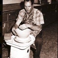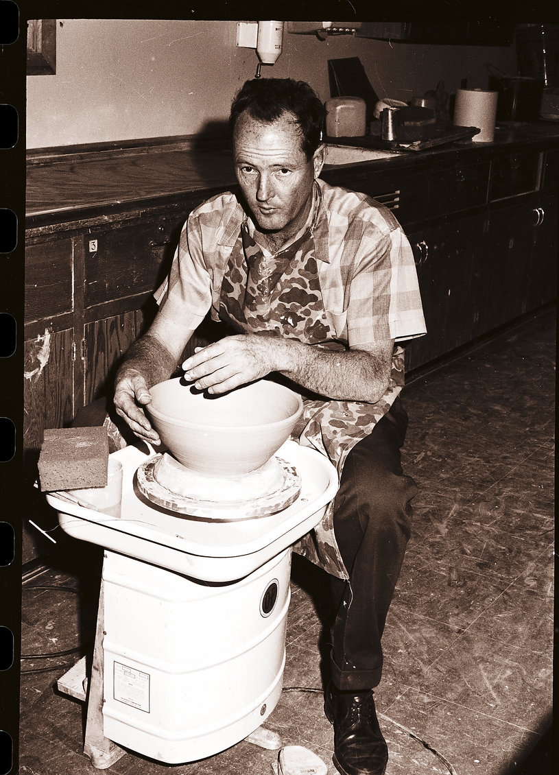 - CSI student Robert Grubbs makes a pottery bowl on a spinning wheel for the art show to be held during CSI's Festival of the Art. Behind him is a long counter, and several kitchen appliances and utensils sit on top of it.