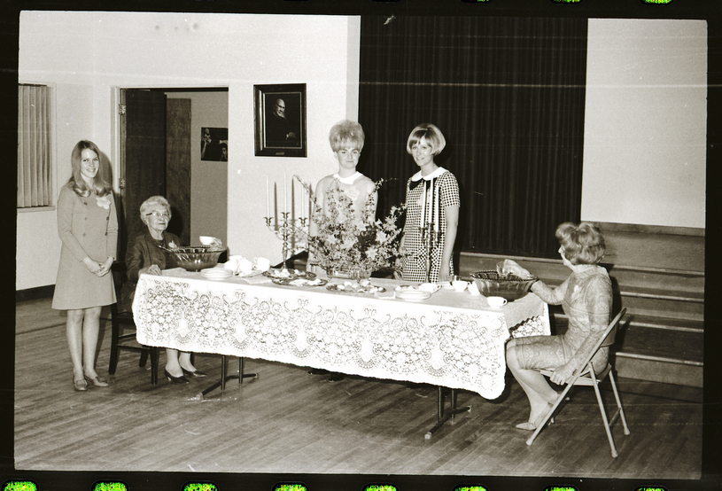 Two women sit at the ends of a table, helping themselves to punch at a Panhellenic Tea for high school seniors, hosted by nine sororities from the University of Idaho at the Bishop Rhea Auditorium. The table is covered in a lace tablecloth, and on it are cups, plates, bowls of punch, platters of cookies, a bouquet of flowers, and a candle holder. Two girls stand behind the table, and another stands to the side. Behind the table is a stage, and hanging on the back wall is a photograph of a man.