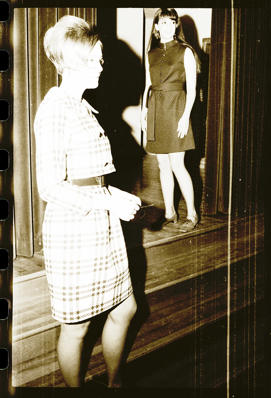 Showing fashions worn on the University of Idaho campus during a Panhellenic Tea for high school seniors, held at the Bishop Rhea Auditorium, are Jan Ashenbrener, right, and Jerri Cook.