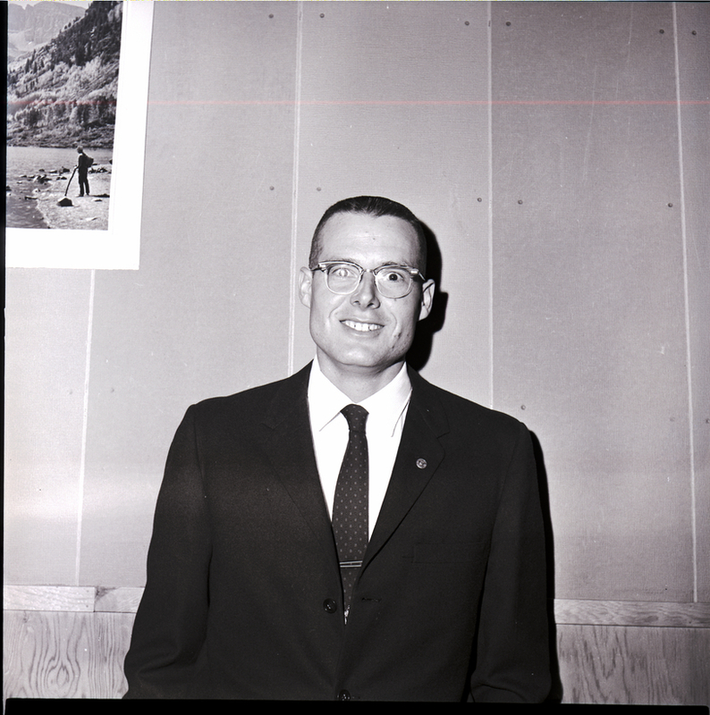 Lewis Pence, new Soil Conservation Service aide in Buhl, stands in an office. He is dressed in a suit and tie. An image of a hiker standing on a river bank down in a canyon hangs on the back wall.